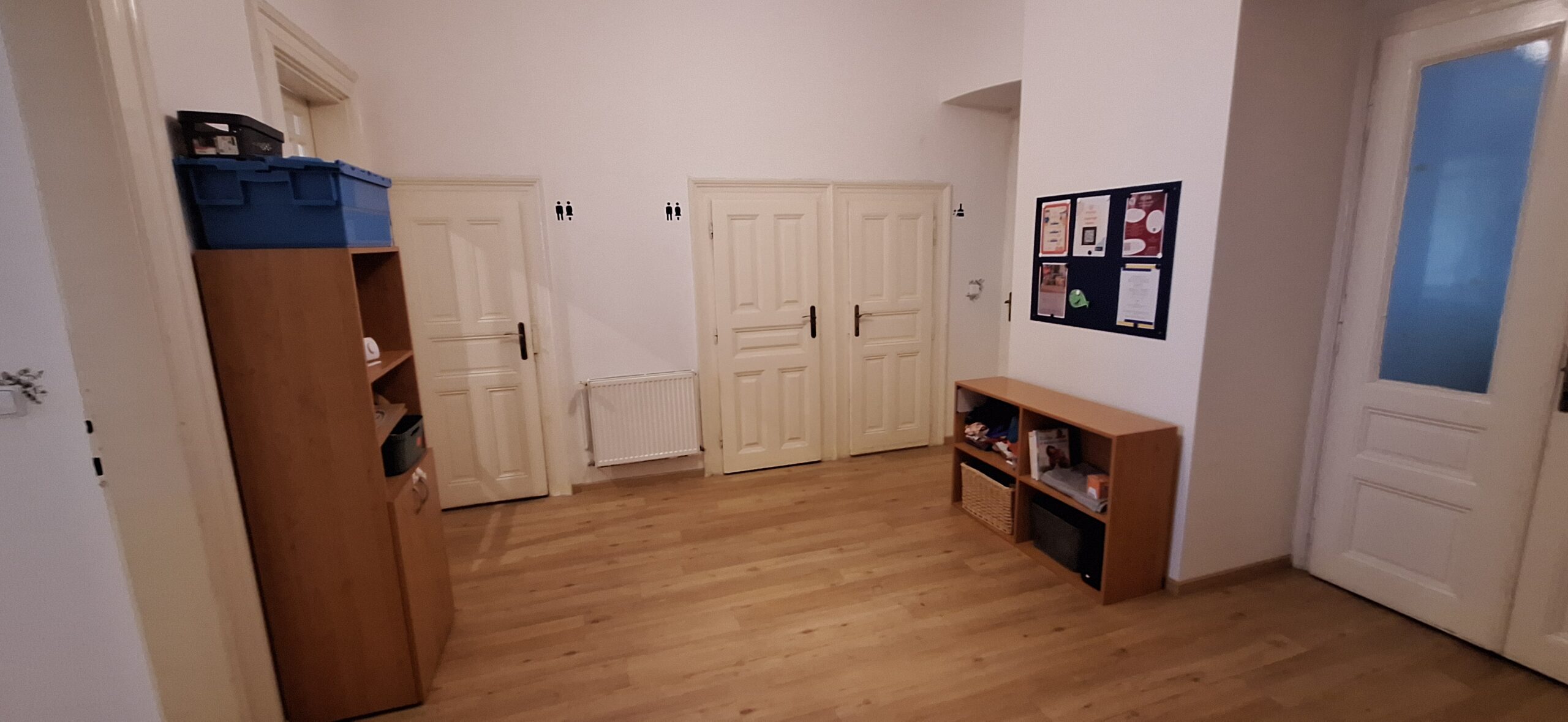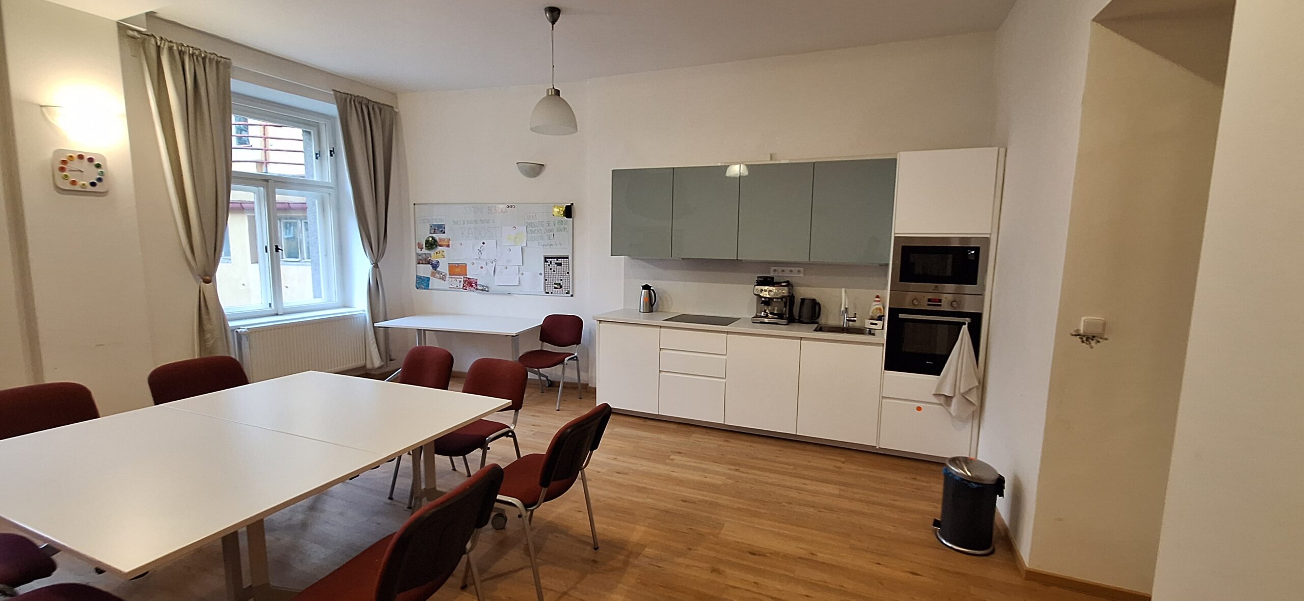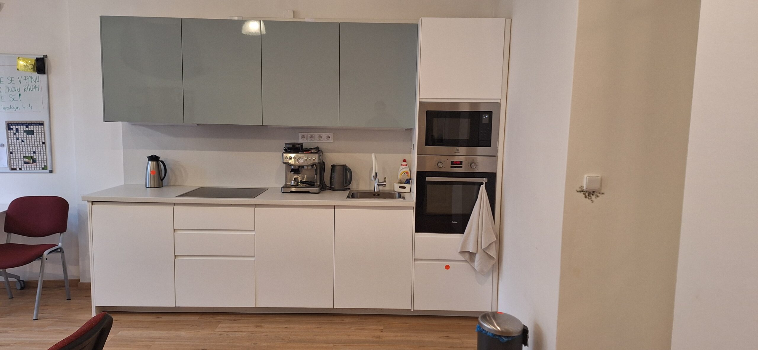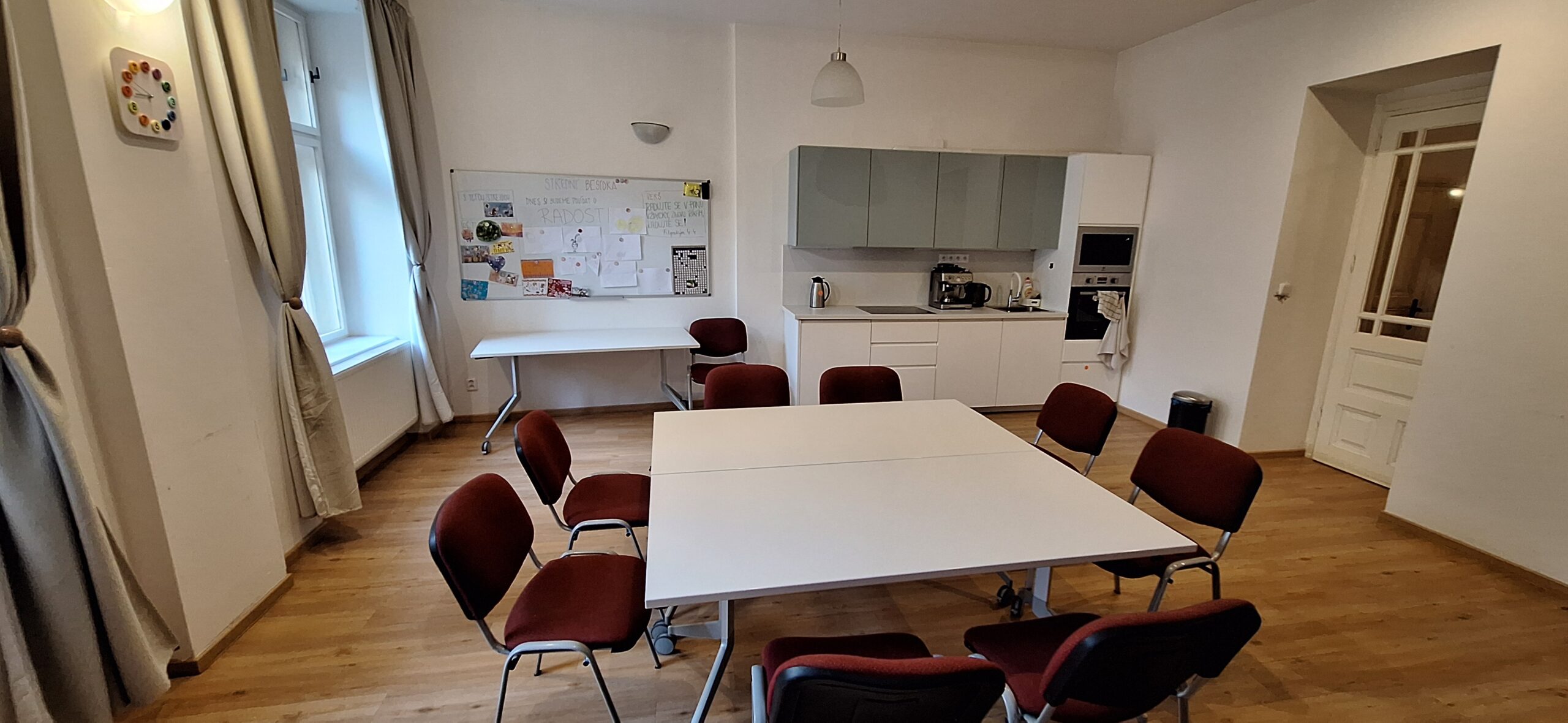 - Hlavní místnost vybavená třemi stoly a židlemi, magnetickou tabulí, plně vybaveným kuchyňským koutem.
