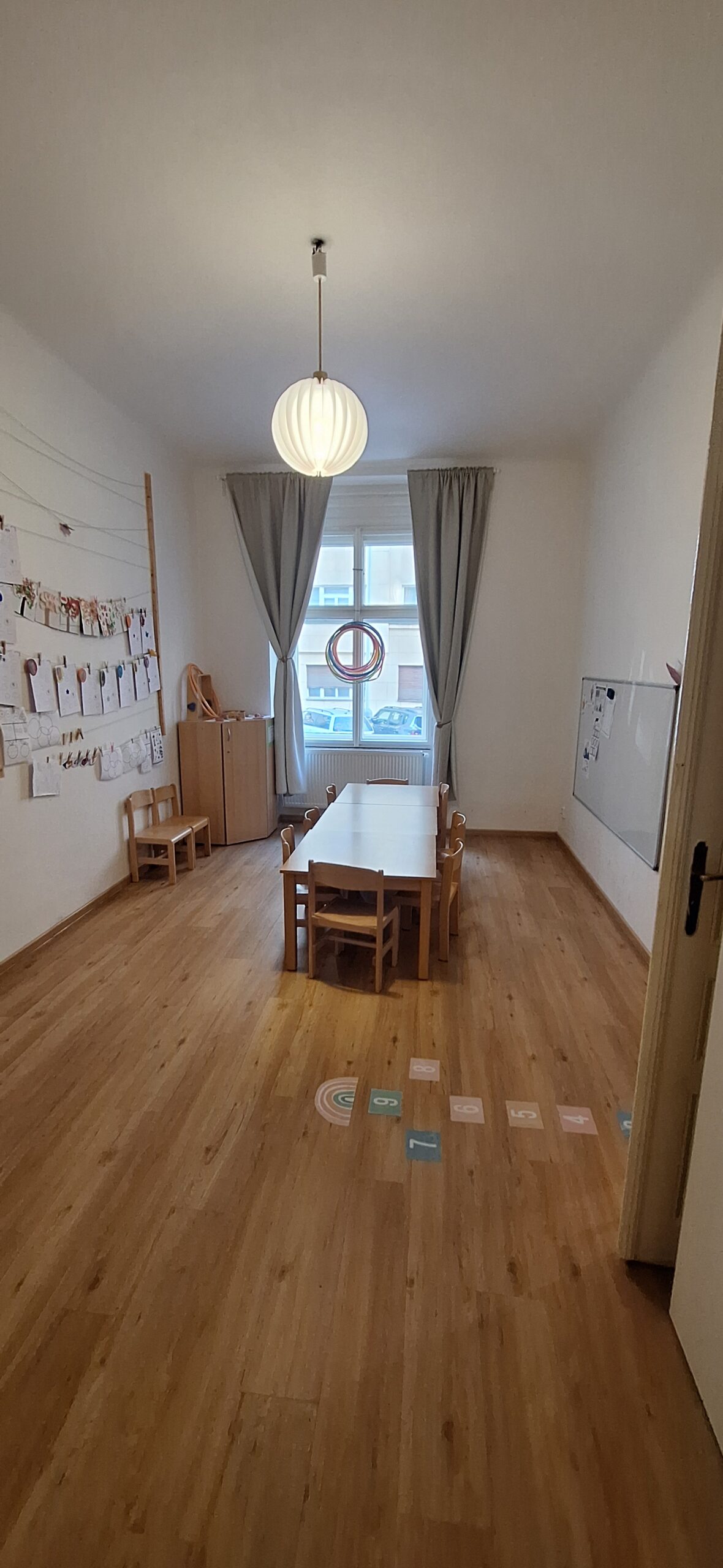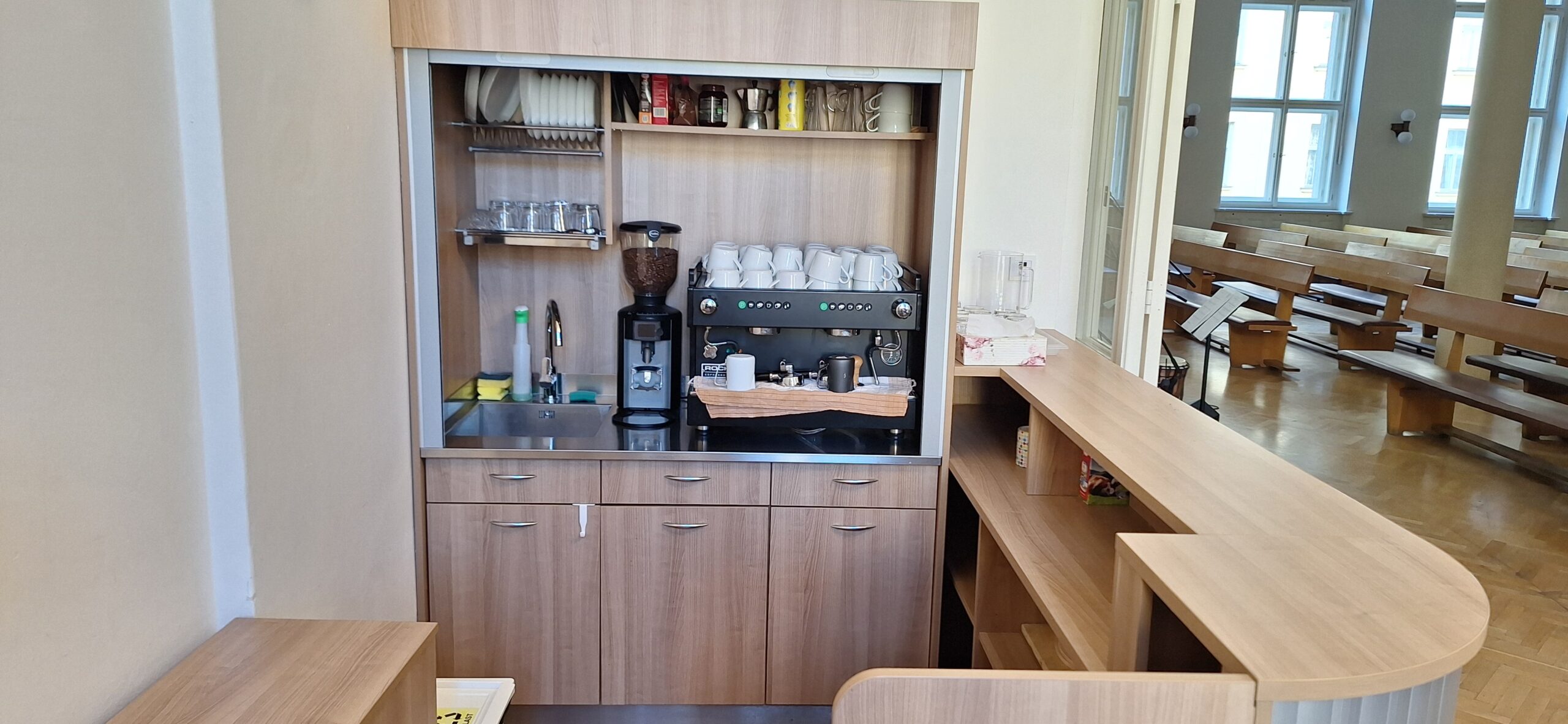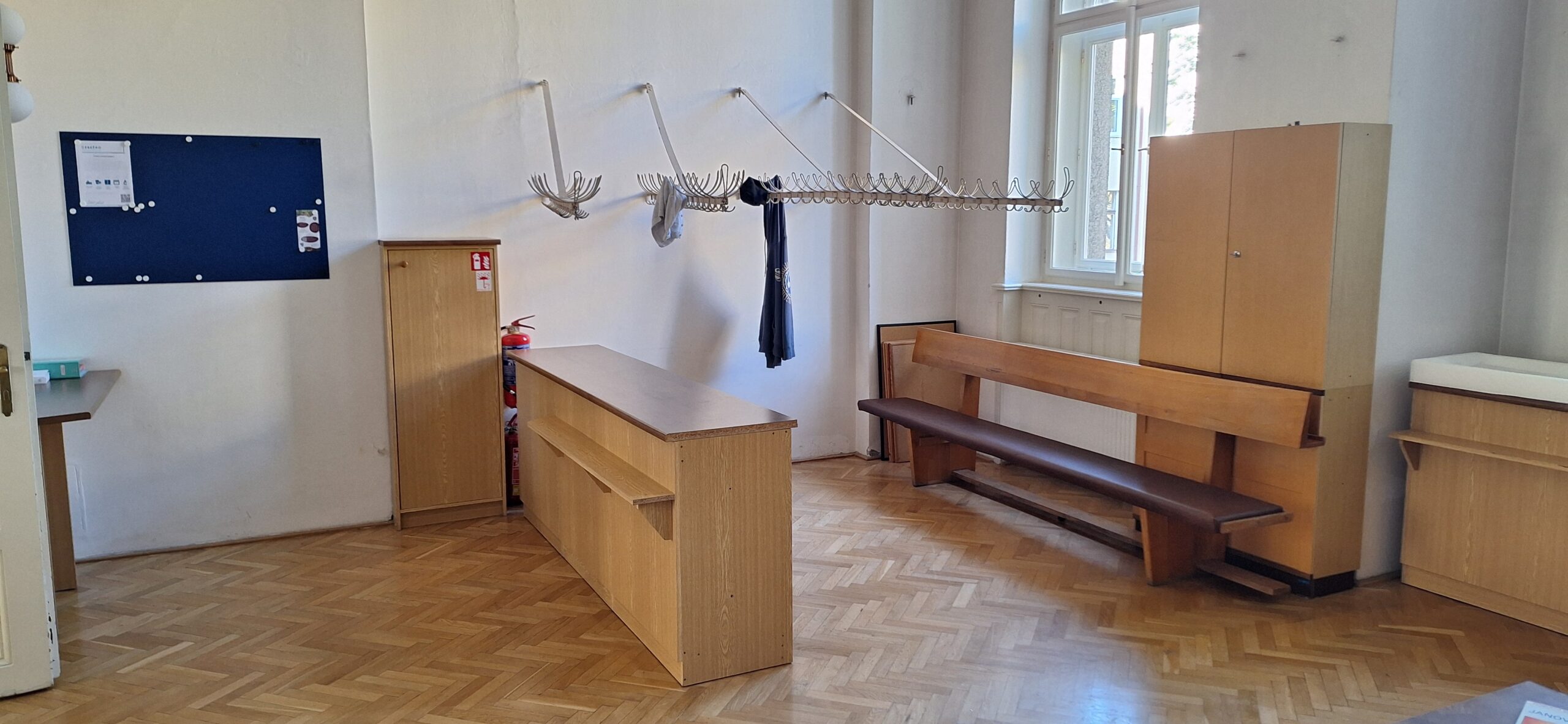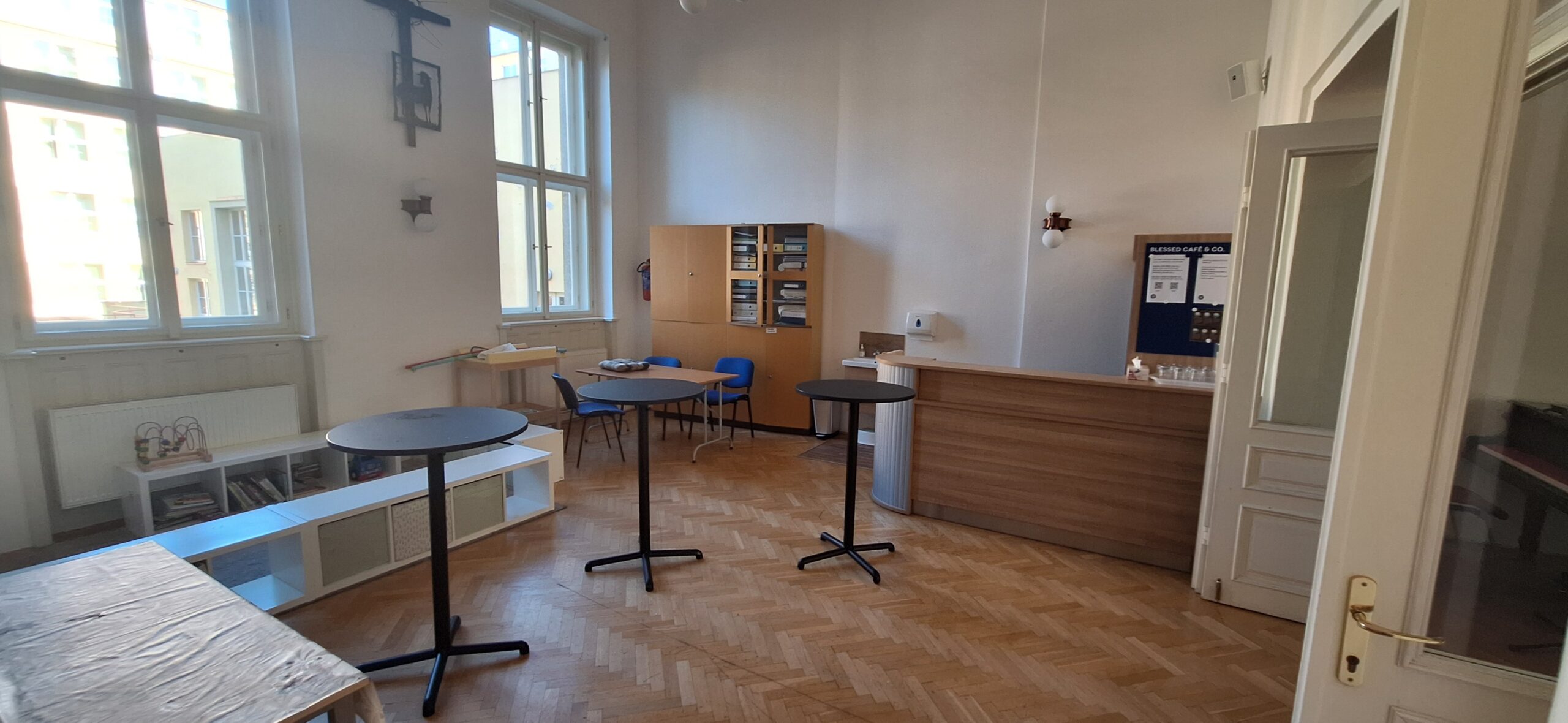 - Hlavní místnost vybavená třemi stoly a židlemi, magnetickou tabulí, plně vybaveným kuchyňským koutem.