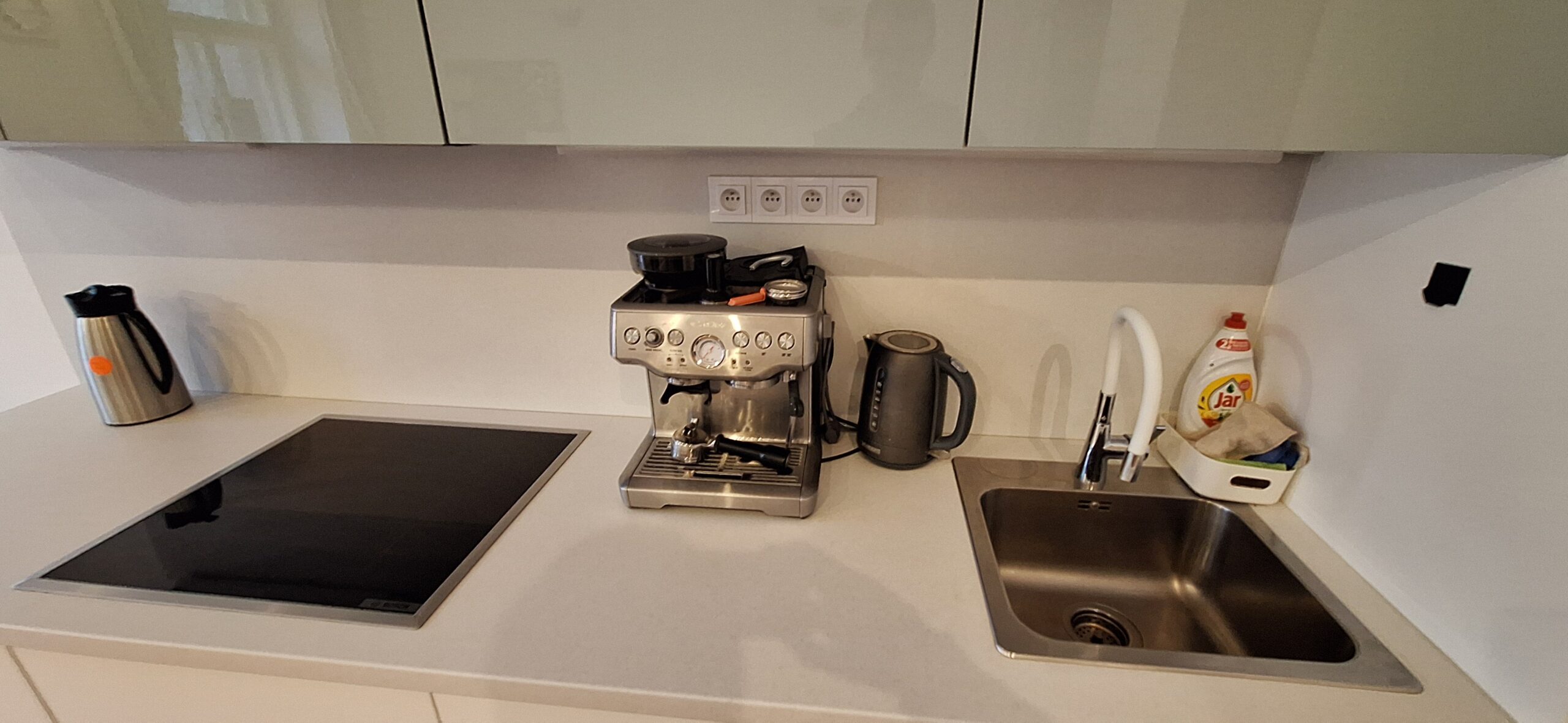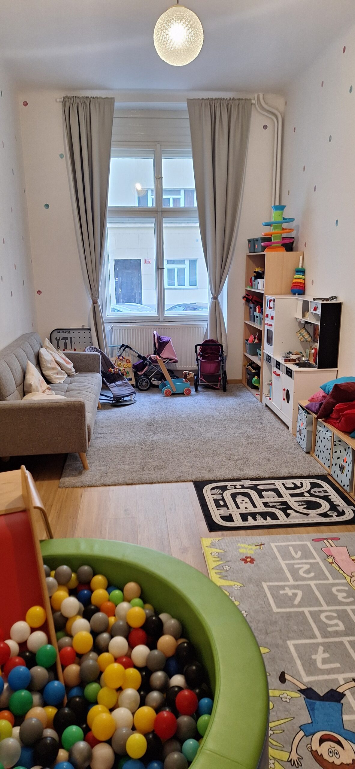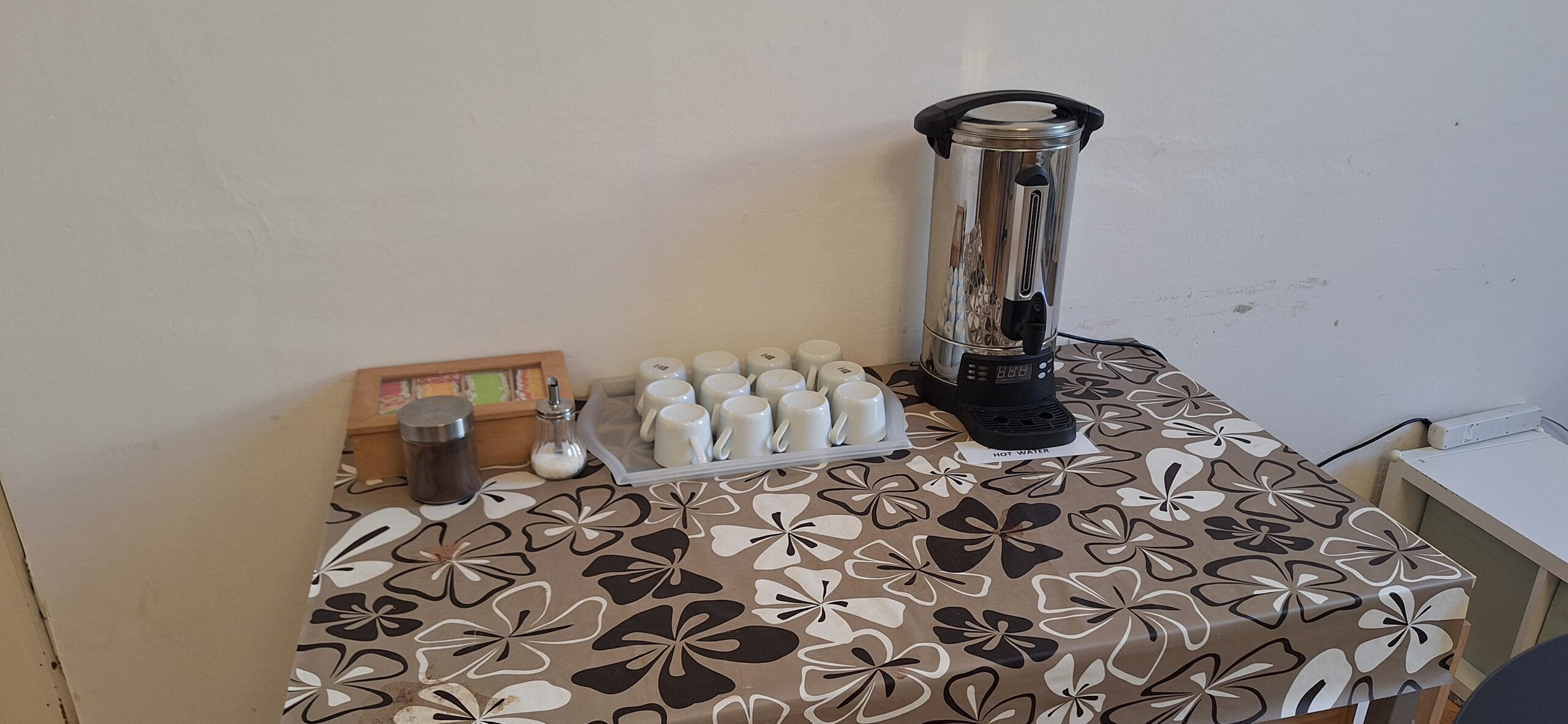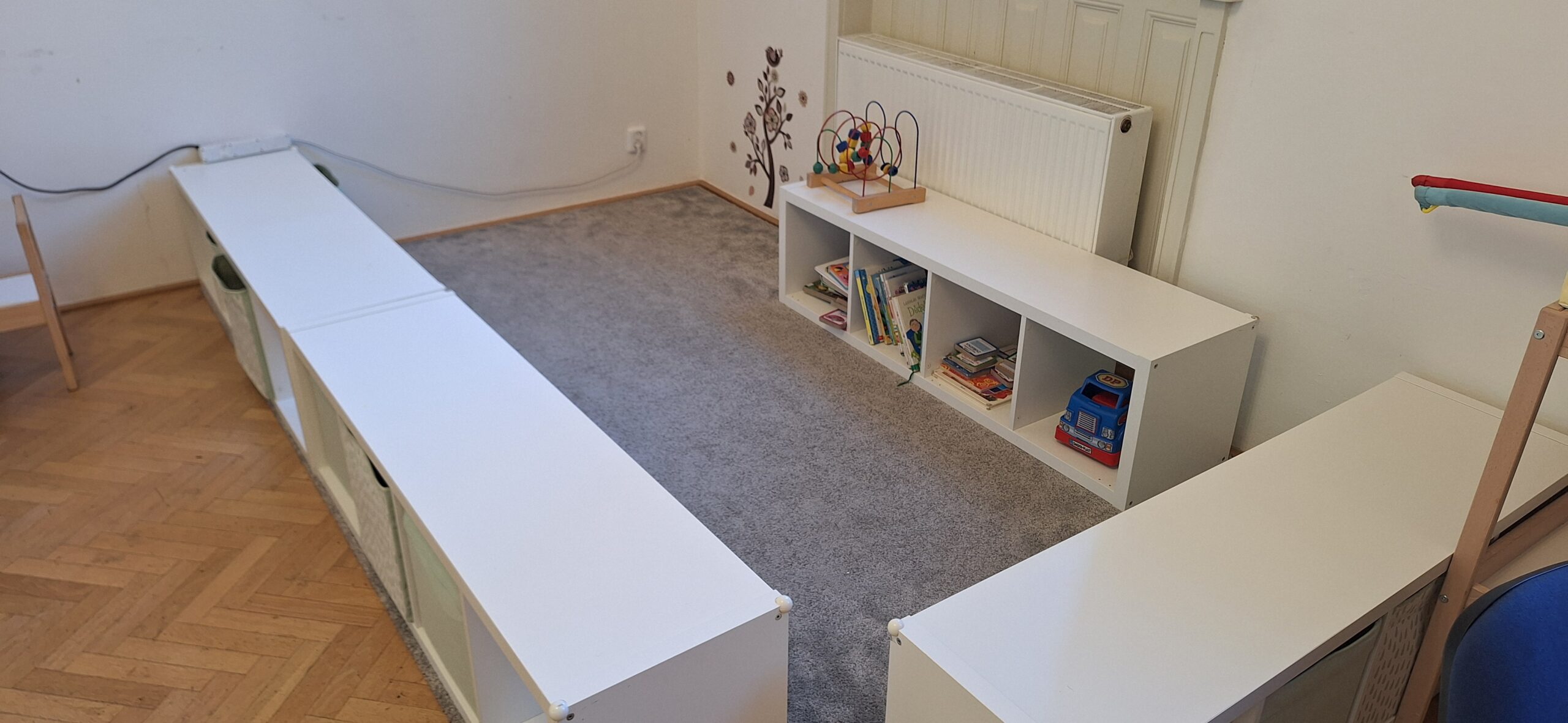 - Hlavní místnost vybavená třemi stoly a židlemi, magnetickou tabulí, plně vybaveným kuchyňským koutem.